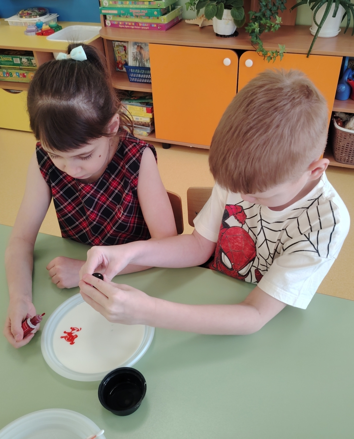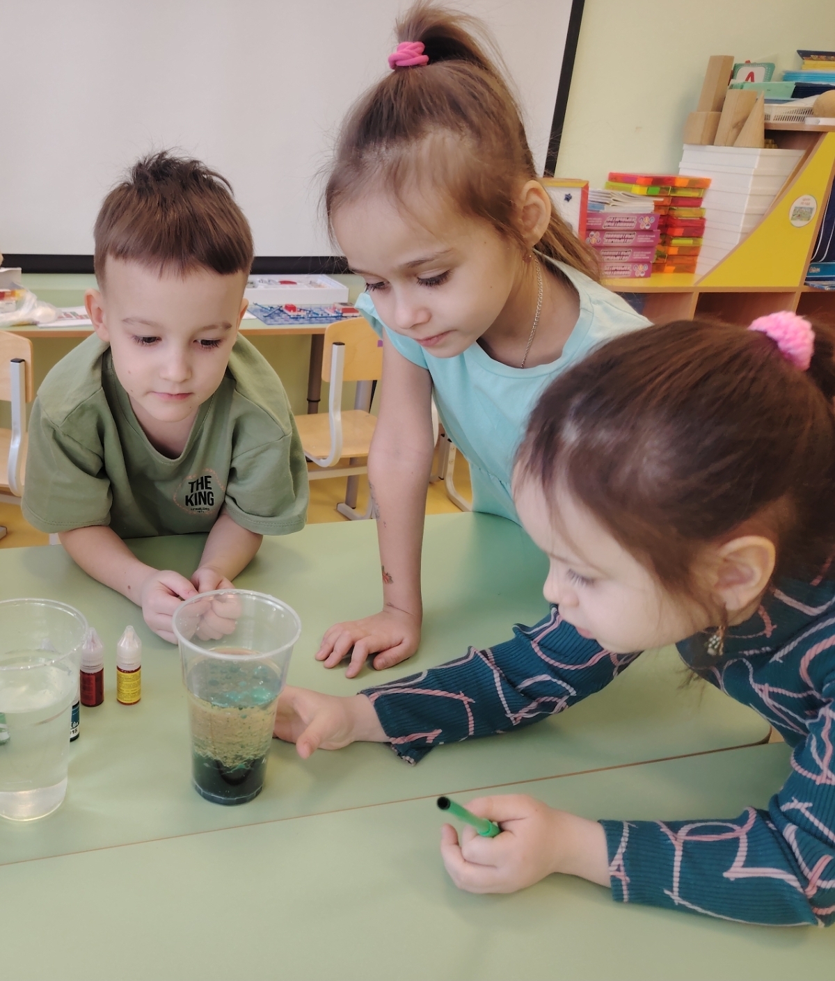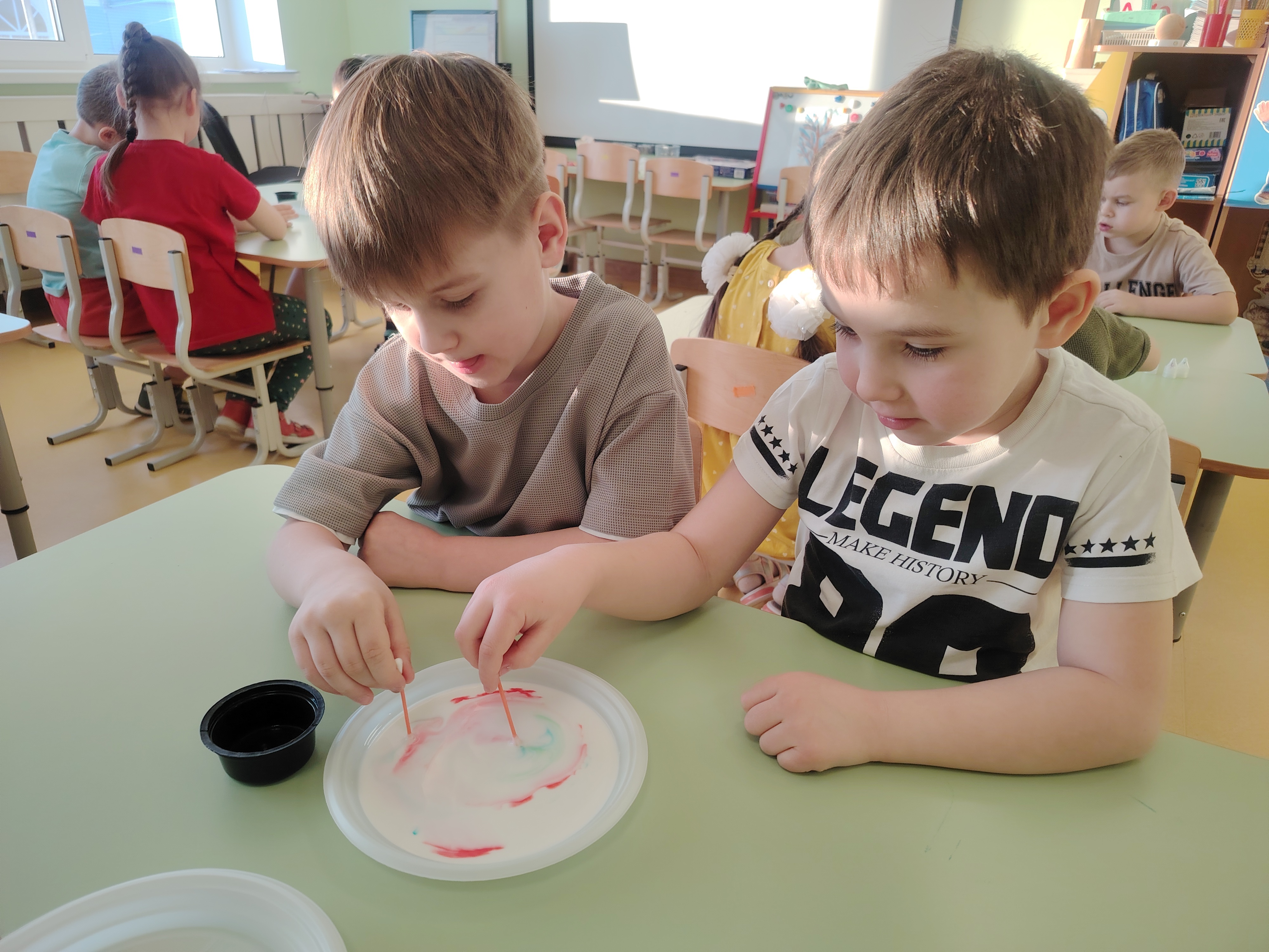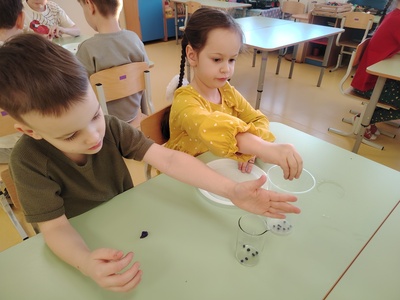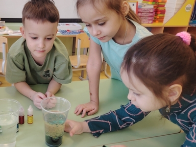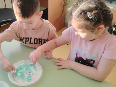 Ребята нашей группы попали в настоящую лабораторию, где познакомились с профессией ученого и рассказами об известных открытиях, а потом изучали окружающий мир с помощью простых и забавных экспериментов: рисовали красивые узоры на молоке, заставляя их двигаться; определяли, когда пластилин тонет в воде и как можно его заставить всплывать на поверхность. А «цветные пузырьки» позволили ребятам увидеть, как выделяется углекислый газ!